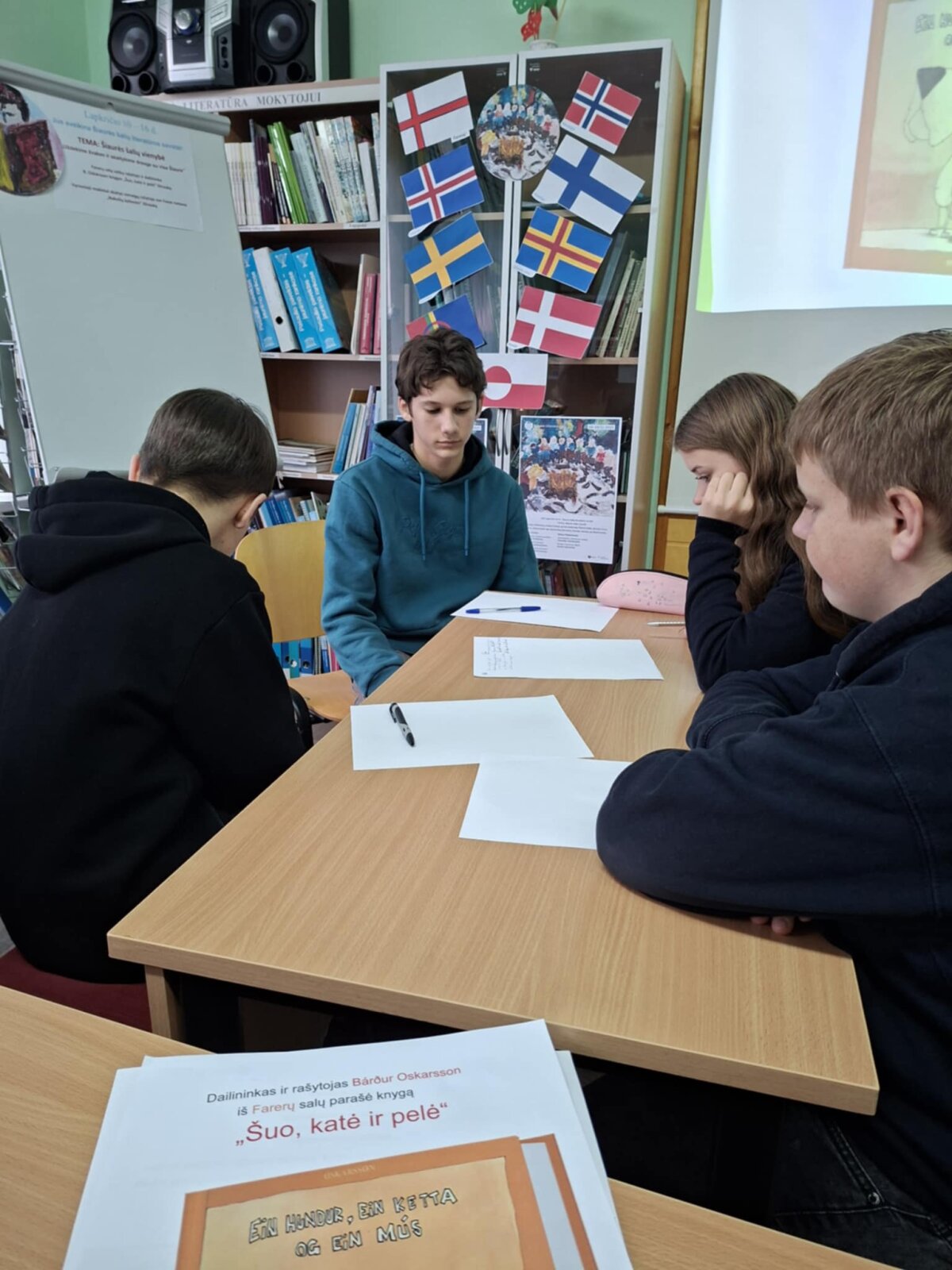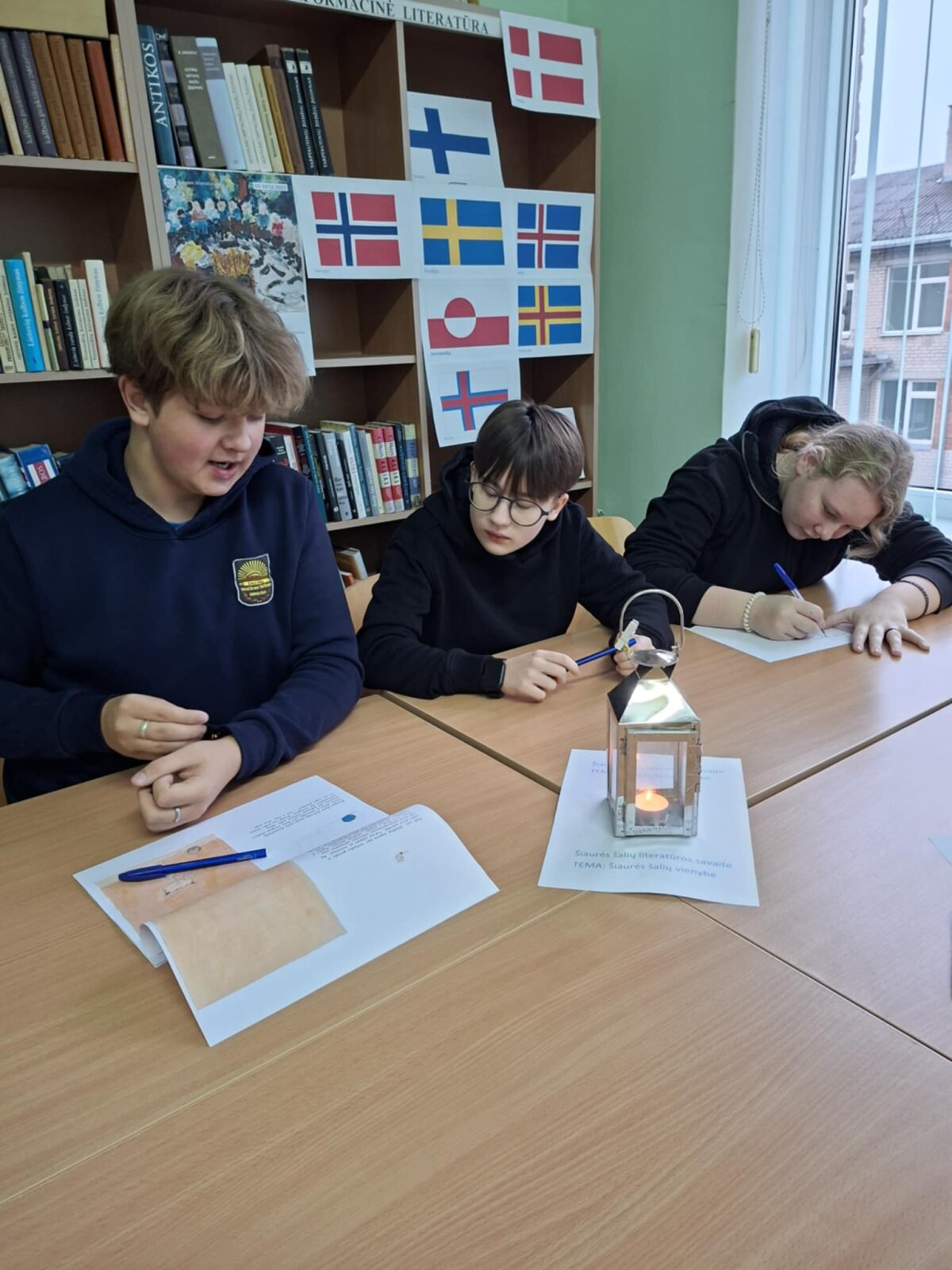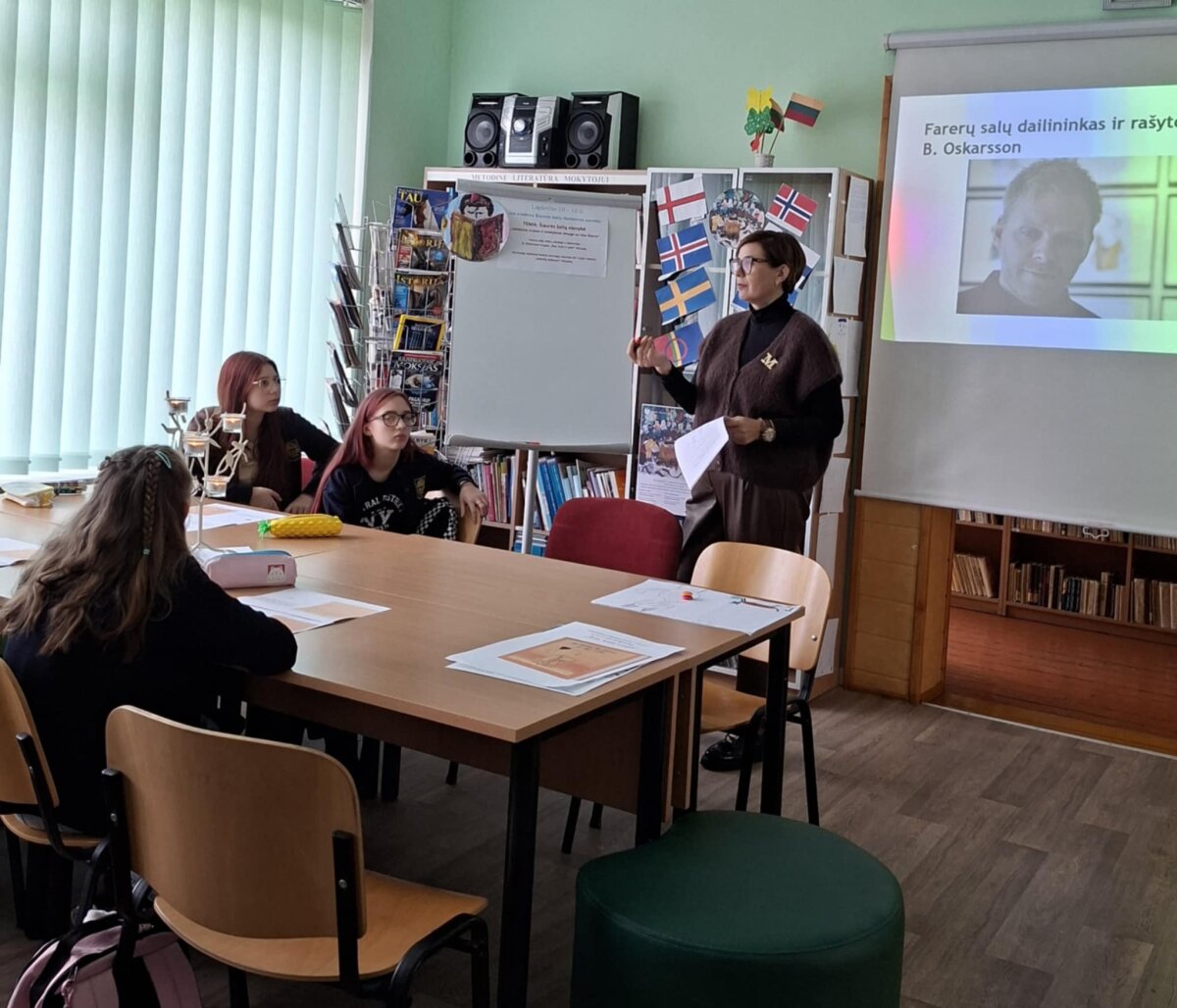 Kai rudens sutemos apgaubia žemę ir dienos tampa vis trumpesnės, jaukioje šviesų apsuptyje vėl sugrįžta Šiaurės šalių literatūros savaitė. Tai projektas, suburiantis skaitytojus, klausytojus ir kūrėjus nuo Islandijos fiordų iki Baltijos pajūrio. Šios savaitės metu skaitomi išskirtiniai Šiaurės šalių autorių kūriniai. Lapkričio 10-oji didžioji garsinio skaitymo diena. Ankstų pirmadienio rytą į biblioteką skubėjo aštuntos, septintos klasės mokiniai, mokytojos Stasė Mažučiūnienė, Jurgita Mašnickienė. Bibliotekininkė Nijolė Valatkienė pristatė projektą, paruošta šiaurės šalių rašytojų kūrinių paroda, skaitykla papuošta Šiaurės šalių vėliavomis. Užsidegę žvakes, mokiniai garsiai skaitė Farerų salų rašytojo ir dailininko knygos „Šuo, katė ir pelė“ ištrauką. Aštuntokai vaidino scenas pagal kūrinį, kūrė eilėraščius šia tema anglų kalba. Aktyvus darbas vyko grupėse. Mokiniai užduotis atlikinėjo noriai ir išradingai. Lietuvišką tekstą vertė į anglų kalbą. Piešė piešinius, juos pristatė.