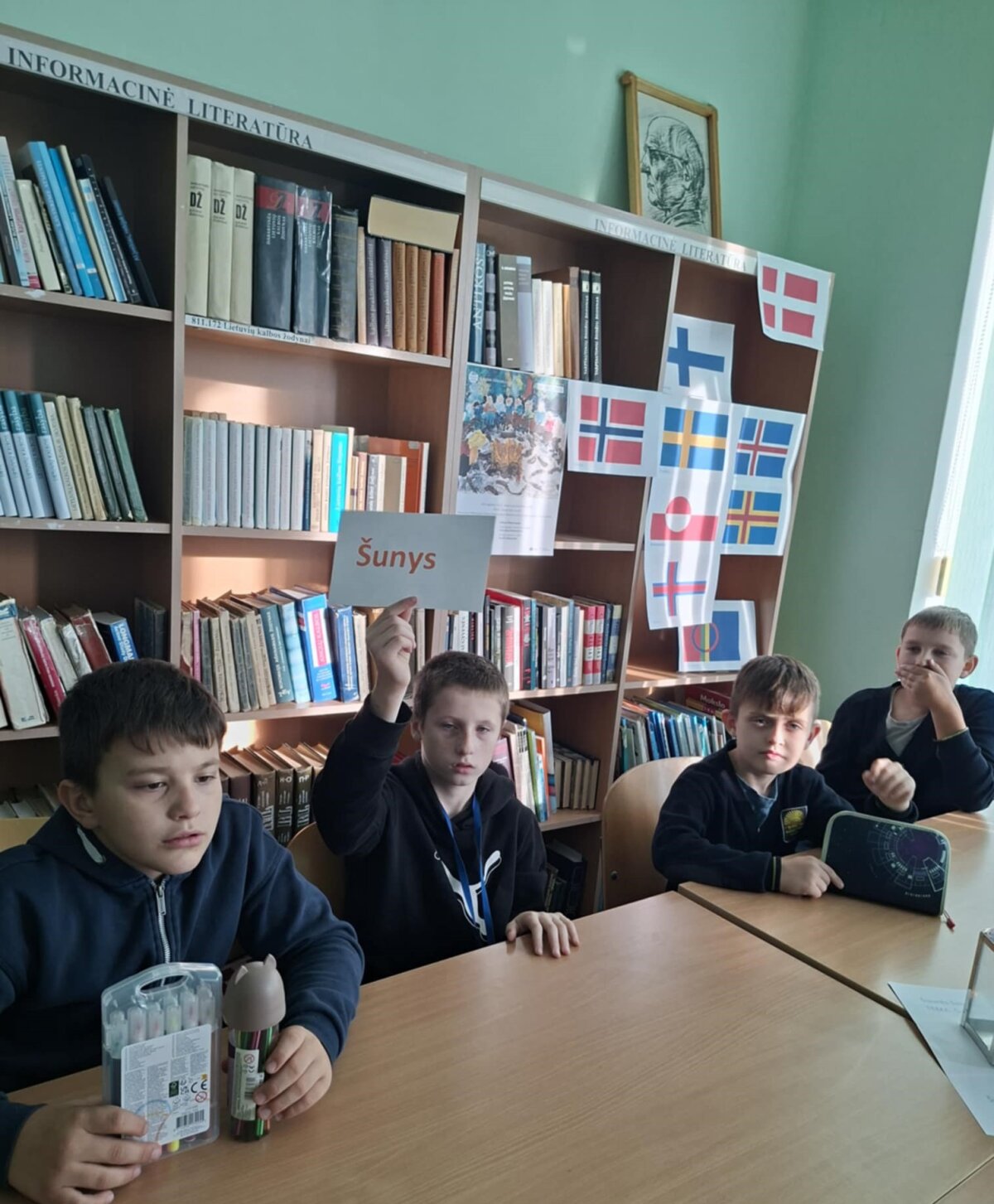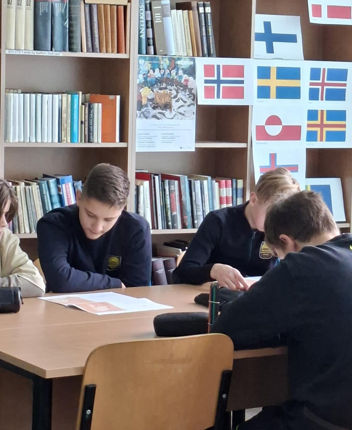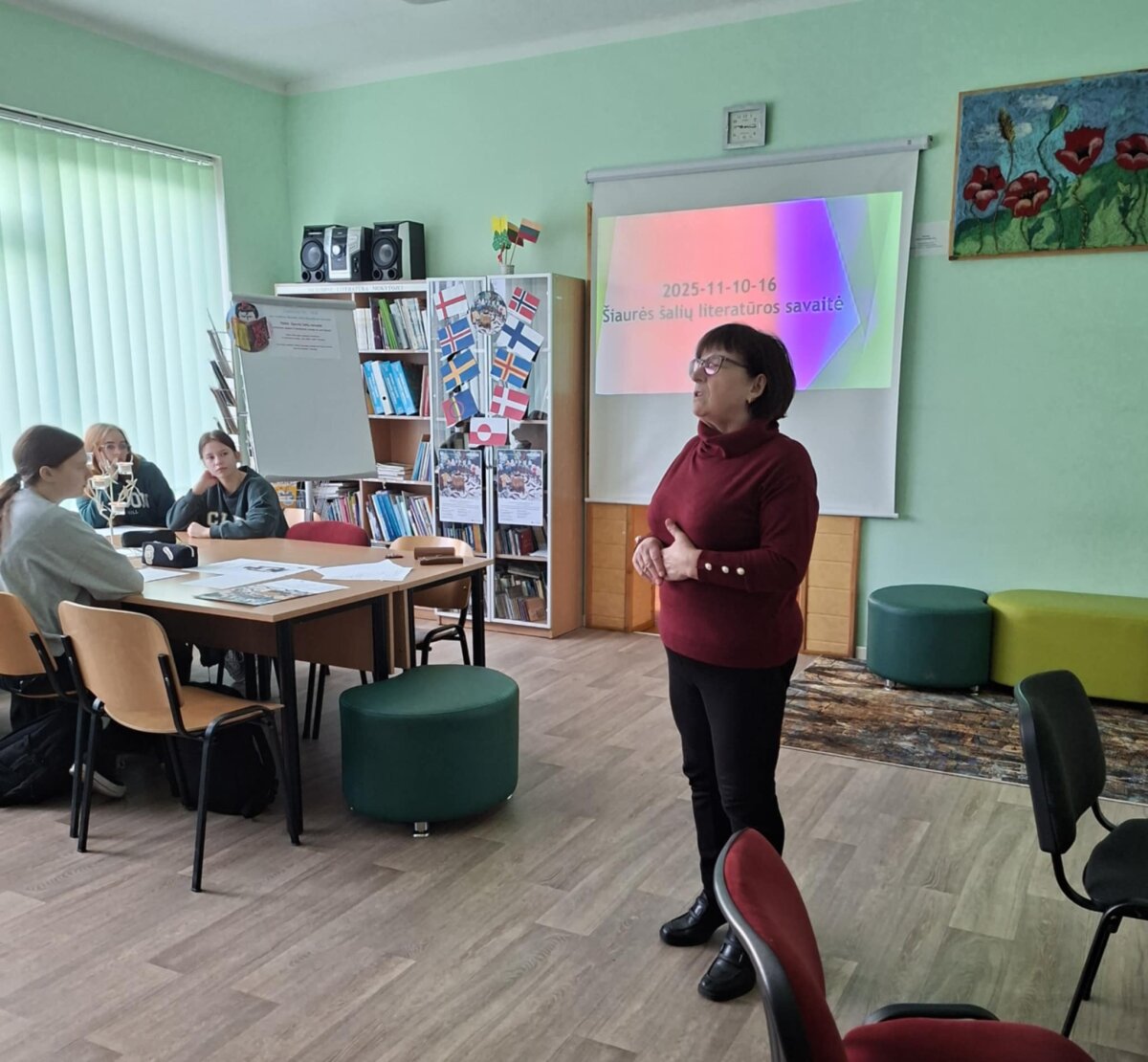 Kai rudens sutemos apgaubia žemę ir dienos tampa vis trumpesnės, jaukioje šviesų apsuptyje vėl sugrįžta Šiaurės šalių literatūros savaitė. Tai projektas, suburiantis skaitytojus, klausytojus ir kūrėjus nuo Islandijos fiordų iki Baltijos pajūrio. Šios savaitės metu skaitomi išskirtiniai Šiaurės šalių autorių kūriniai. Lapkričio 10-oji didžioji garsinio skaitymo diena. Ankstų pirmadienio rytą į biblioteką skubėjo aštuntos, septintos klasės mokiniai, mokytojos Stasė Mažučiūnienė, Jurgita Mašnickienė. Bibliotekininkė Nijolė Valatkienė pristatė projektą, paruošta šiaurės šalių rašytojų kūrinių paroda, skaitykla papuošta Šiaurės šalių vėliavomis. Užsidegę žvakes, mokiniai garsiai skaitė Farerų salų rašytojo ir dailininko knygos „Šuo, katė ir pelė“ ištrauką. Aštuntokai vaidino scenas pagal kūrinį, kūrė eilėraščius šia tema anglų kalba. Aktyvus darbas vyko grupėse. Mokiniai užduotis atlikinėjo noriai ir išradingai. Lietuvišką tekstą vertė į anglų kalbą. Piešė piešinius, juos pristatė.